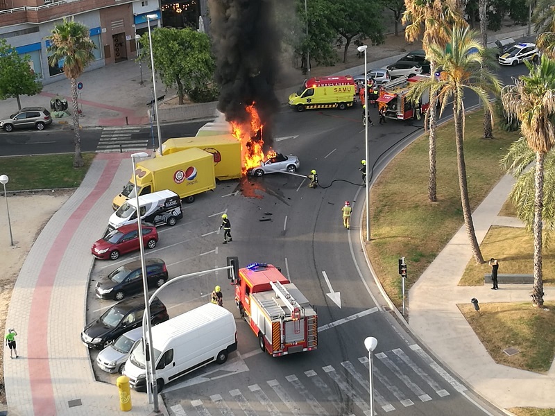La regidoria de Seguretat de l’Ajuntament informa que els Bombers del Servei de Prevenció, Extinció d’Incendis i Salvament (SPEIS) han extingit hui un aparatós incendi, que s’ha originat en impactar un vehicle contra un camió per causes que investiga la unitat d’Atestats de la Policia Local d’Alacant, en la glorieta d’Esportista Sergio *Cardell.