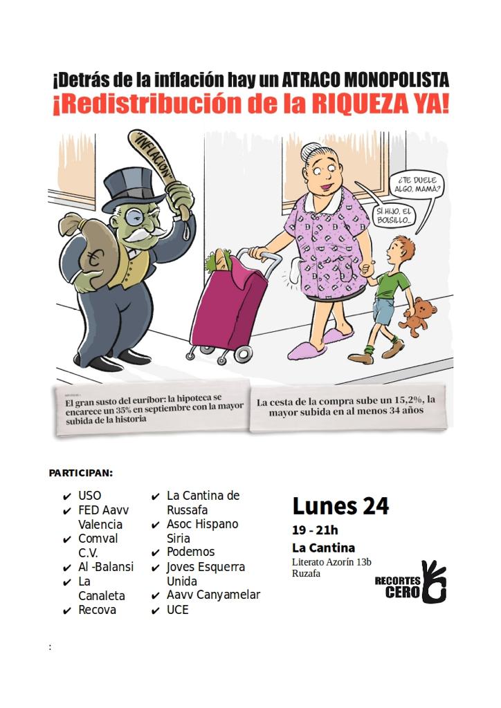 La organización de Recortes Cero en Valencia va a realizar un acto sobre cómo está afectando la inflación en nuestra ciudad. ¿Cómo está afectando a nivel laboral?, ¿y a la juventud?, ¿y en materia de derechos? Todas y muchas más preguntas queremos abordar en esta radiografía de la población de Valencia. Bajo el título de “¿Cómo nos afectan la crisis y la inflación? Propuestas e iniciativas para nuestra comunidad” las organizaciones se sentarán a debatir que iniciativas llevar adelante a nivel local.