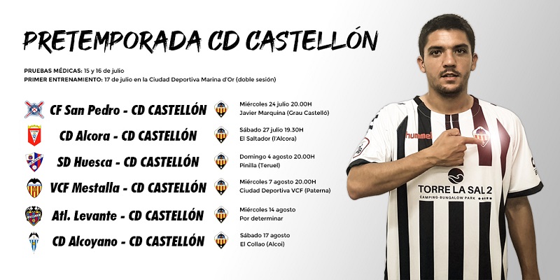 En el que refereix als partits amistosos que disputarà el CD Castelló durant els mesos de juliol i agost, la Direcció Esportiva i el cos tècnic han planificat disputar fins a huit partits durant aquestes cinc setmanes, dels quals ja hi ha sis confirmats: Sant Pere i l’Alcora seran els dos rivals provincials per a fer les primeres probes el 24 i 27 de juliol, respectivament, mentre que a poc a poc el CD Castelló anirà pujant el nivell i s’enfrontarà a l’Osca, acabat de descendir de Primera Divisió, el 4 d’agost en el camp de Pinilla (Terol). A continuació, els ‘orelluts’ es mesuraran a dos rivals del Grup III de Segona B que a més són els dues filials dels principals equips autonòmics: València Mestalla i Atlètic Llevant, el 7 i 14 d’agost, respectivament. Finalment, el CD Castelló té previst posar el fermall final a la pretemporada el 17 d’agost en El Collao davant l’Alcoià, acabat de descendir a Tercera Divisió.