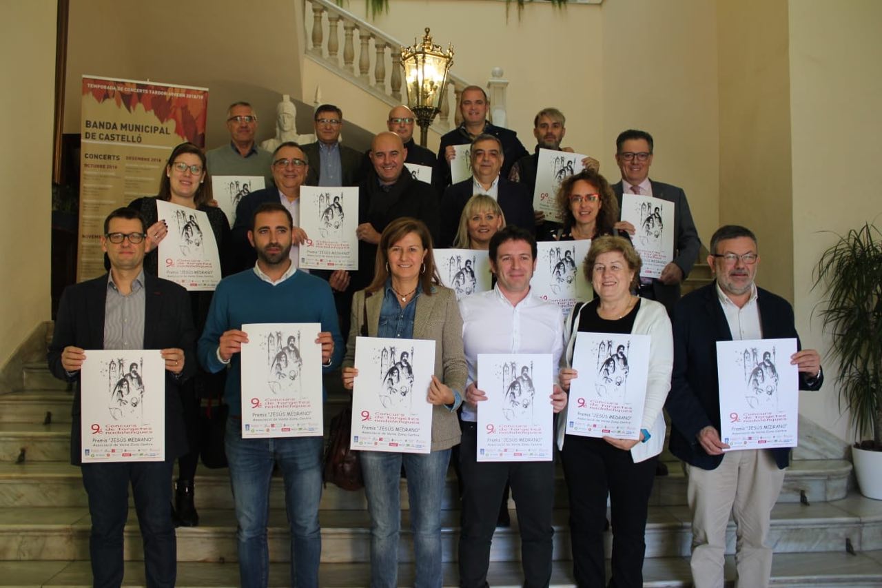 L’Ajuntament de Castelló ha acollit hui la presentació del cartell oficial de la novena edició del Concurs de targetes nadalenques ‘Jesús Medrano’, posada en marxa per l’Associació de Veïns Zona Centre de Castelló i que enguany compta amb el suport de la Conselleria d’Educació, Recerca, Cultura i Esport, Turisme de la Generalitat, Diputació de Castelló, Ajuntament de Castelló, Federació d’Associacions de Mares i Pares d’Alumnes Penyagolosa (FAMPA Penyagolosa), Patronat Municipal de Festes, Fundació Dávalos-Fletcher, BP Oil, Cajamar, Coca-cola, Llibreria Argot, A1F Sport, Haba Monsalve, Higinio Mateu, Mudances Paco Valls i Pirotècnia Peñarroja. Els representants de les entitats col•laboradores s’han fet la fotografia de família a l’escalinata del Palau Municipal.