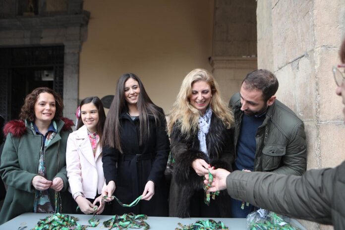 L’alcaldessa de Castelló, Amparo Marco; el regidor de Festes, Omar Braina; la presidenta de la Junta de Festes, Noelia Selma; i les reines de les festes Natalia Palacio i Natalia Collazos han procedit aquest matí al repartiment de les polseres oficials de la Magdalena 2019, de les quals en total es repartiran 70.000 unitats.