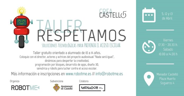 El cicle de tres tallers que dirigeix l’associació Robotme arriba a la seua fi. En aquesta ocasió, els escolars de 10 i 14 anys idearan solucions tecnològiques per a previndre i combatre l’assetjament escolar. Es tracta d’una acció emmarcada en el projecte «Crea Castelló, conscienciació social i aprenentatge tecnològic per a la transformació de Castelló a través de la innovació», que finança l’Ajuntament de Castelló. Mitjançant el taller ‘Respectem’, la robòtica tornarà a l’espai cultural El Menador els divendres 5 i 12 d’abril de 17.30 a 20.30 i el dissabte 13 del mateix mes de 10.00 a 14.00 hores.